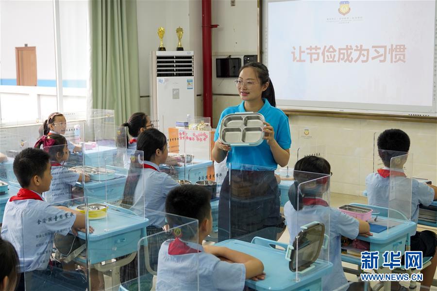 9月1日,重庆市两江新区金渝学校六年级一班的开学第一课上,班主任老师在学生中教育倡导“光盘行动。新华社记者 刘潺 摄