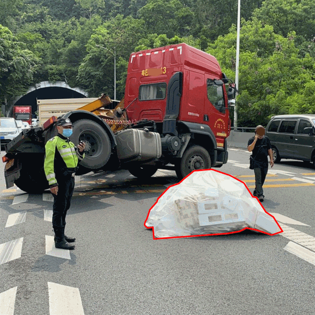 物品掉落后,在最右侧车道行驶的车辆相继急刹车,由任某勇驾驶的重型半挂牵引车,同样行驶在最右侧车道内,并因紧急刹车而发生侧翻。