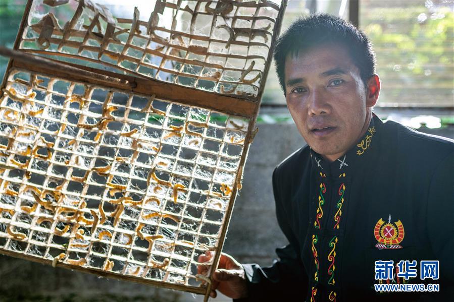 在云南省陇川县陇把镇曼崩村,董跑约展示在方格簇上准备结茧的“蚕宝宝”(8月21日摄)。新华社记者胡超摄
