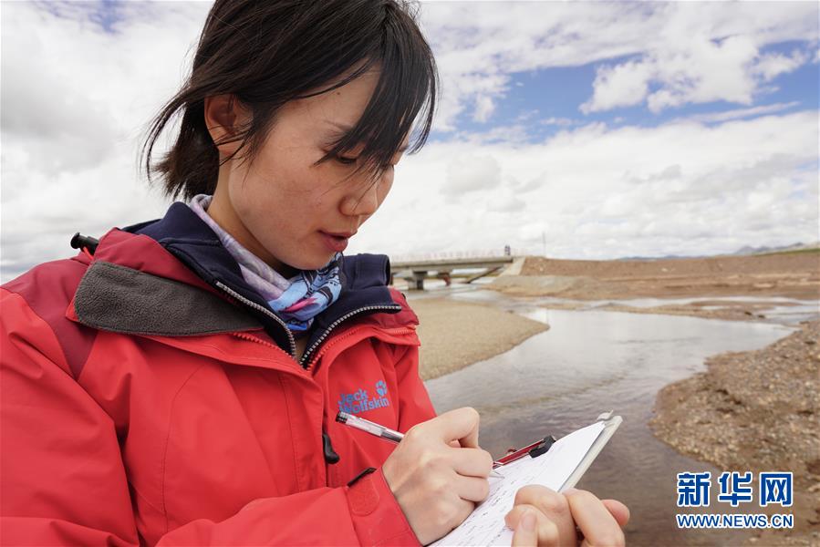 8月14日,长江科学院科考队员闫霞在玉树藏族自治州境内的布曲旁记录取样数据。新华社记者 吴刚 摄