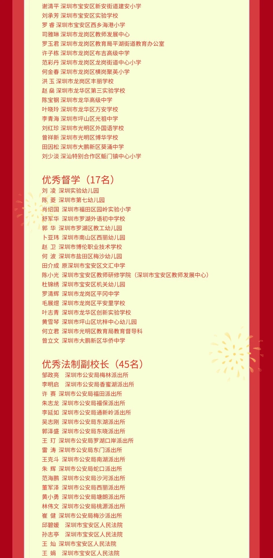 记者从日前公布的名单了解到,李清泉、刘根平同志获“深圳教育改革先锋人物”称号,罗来金、罗诚同志获“教书育人模范”称号,徐怡华等5名同志获“年度教师”称号,孙湧等10名同志获“十佳校长”称号,鲁志国等10名同志获“十佳师德标兵”称号,曹洁等10名同志获“十佳青年教师”称号,深圳大学生命与海洋科学教学实验中心等57个单位获“先进单位”称号,丁惠君等154名同志获“优秀班主任”称号,崔芳等276名同志获“优秀教师”称号,黎科等62名同志获“先进教育工作者”称号,刘凌等17名同志获“优秀督学”称号,邹政亮等45名同志获“优秀法制副校长”称号,何广辉等42名同志获“优秀法制辅导员(校警)”称号。