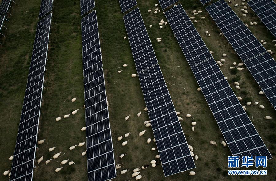 羊群在青海省海南藏族自治州光伏发电园区内吃草(2019年6月16日摄,无人机照片)。新华社记者吴刚摄