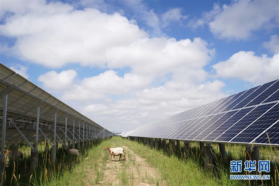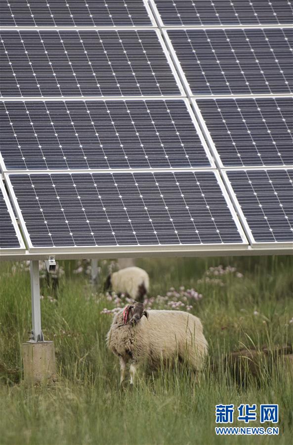 羊群在青海省海南藏族自治州光伏发电园区内吃草(2019年6月16日摄)。新华社记者吴刚摄