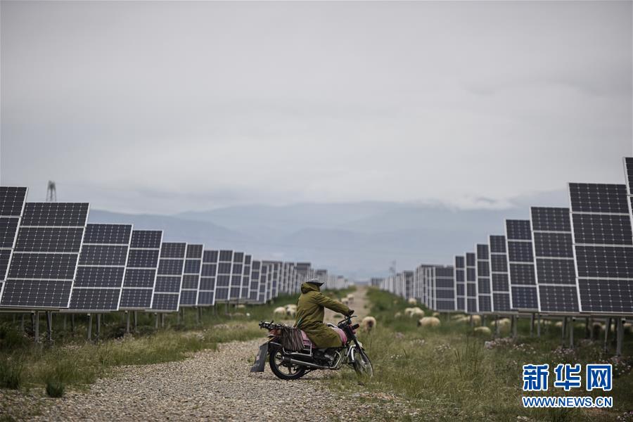 一位牧民在青海省海南藏族自治州光伏发电园区内放牧(2019年6月16日摄)。新华社记者吴刚摄