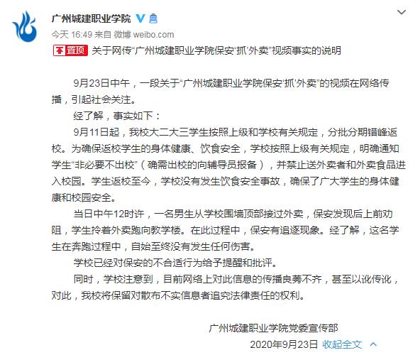 中新网2020年9月23日电 今日,一段关于“广州城建职业学院保安‘抓’外卖”的视频在网络传播,引起社会关注。广州城建职业学院在其官方微博回应,学生未发生任何伤害,学校已经对保安的不合适行为给予提醒和批评。