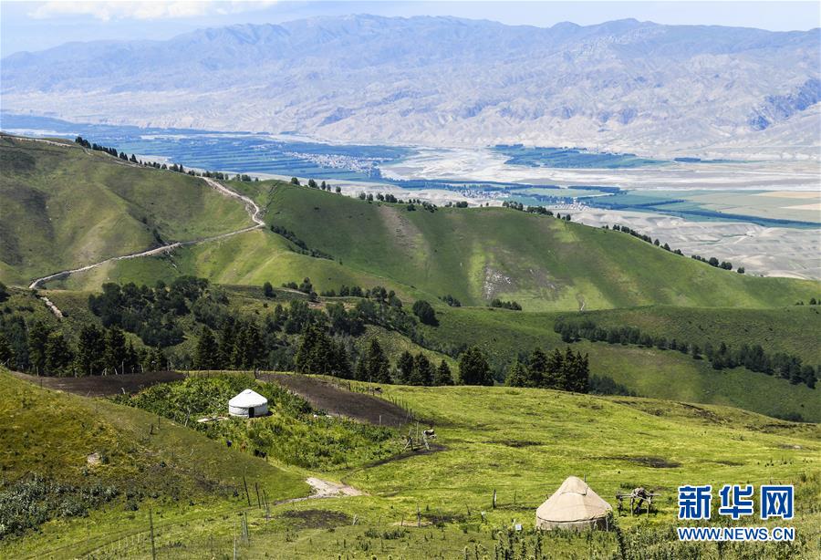 这是新疆特克斯县也什克勒克村夏牧场里牧民达山·哈依达尔居住的毡房,远山脚下的村落是该村的牧民定居点(7月2日摄)。天山深处,许多牧民世世代代迁徙游牧,居无定所,生活贫困。新华社记者王菲摄