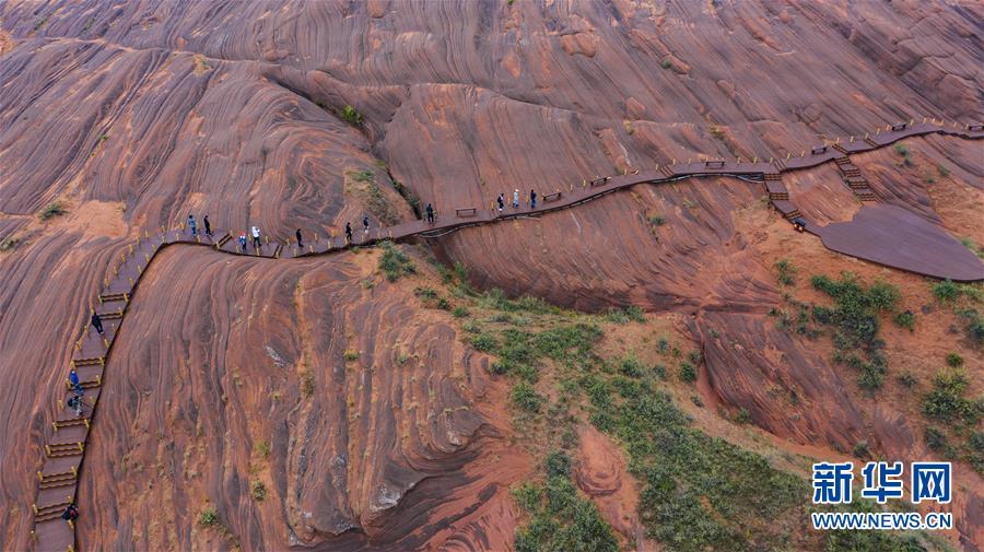 游人在靖边县龙洲镇波浪谷丹霞景区游览(9月26日摄,无人机照片)。陕西省靖边县龙洲镇波浪谷丹霞景区地处陕北黄土高原,地质资源丰富多样,线谷、巷谷、绝壁等构成了特有的波浪形砂岩地貌,形成了罕见的独特景观,是一处集摄影、写生、探险、研学、旅游于一体的好去处。新华社记者陶明摄