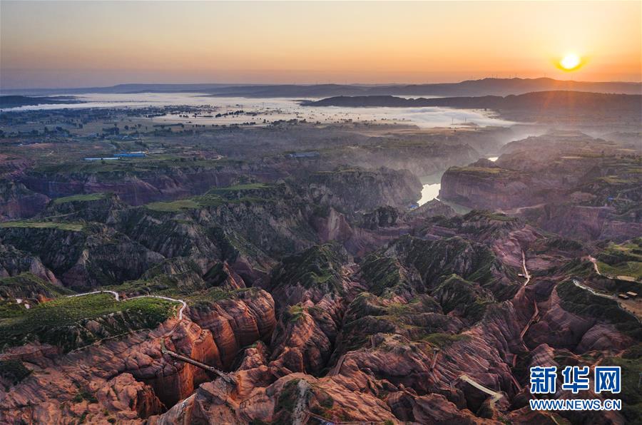 一轮红日照耀着靖边县龙洲镇波浪谷丹霞景区(9月24日摄,无人机照片)。新华社记者陶明摄