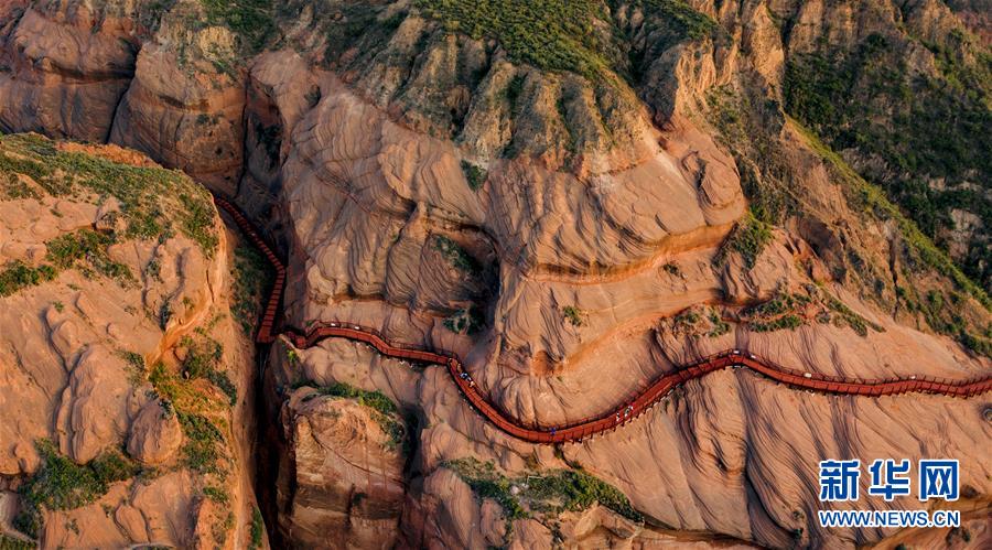 游人在靖边县龙洲镇波浪谷丹霞景区游览(9月24日摄,无人机照片)。新华社记者陶明摄