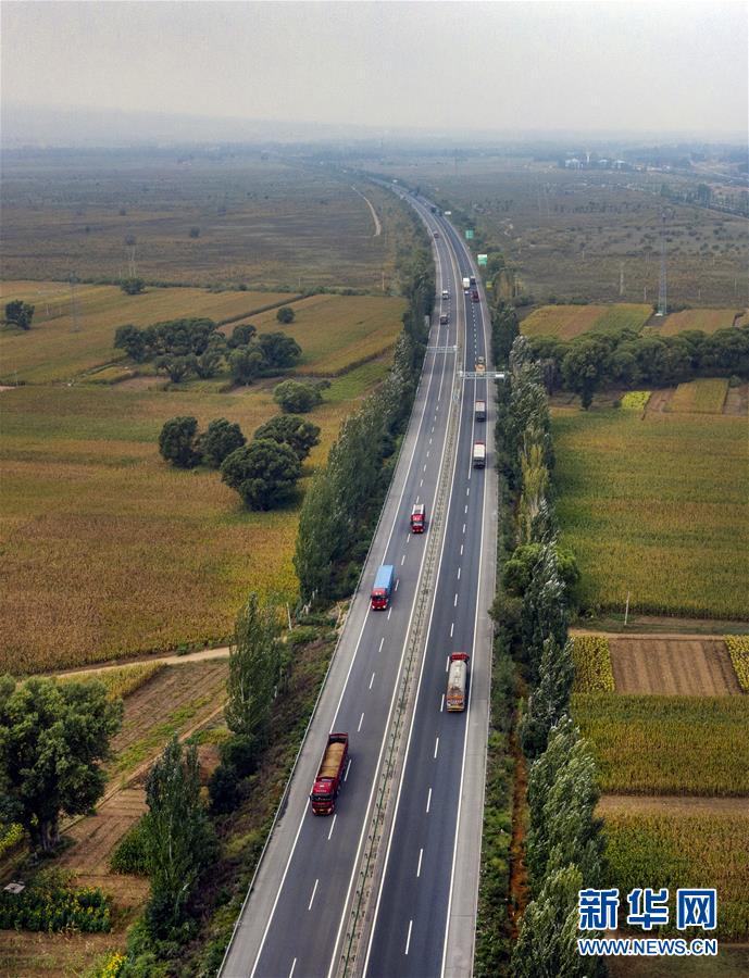 车辆行驶在榆(林)靖(边)高速公路上(9月27日摄,无人机照片)。新华社记者陶明摄