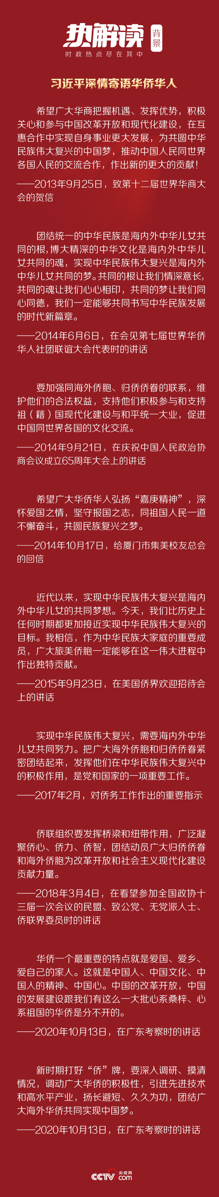 向第十二届世界华商大会致贺信、会见第七届世界华侨华人社团联谊大会代表、叮嘱侨联组织要“广泛凝聚侨心、侨力、侨智”……习近平总书记对广大华侨华人的关怀,一以贯之,情深意长。