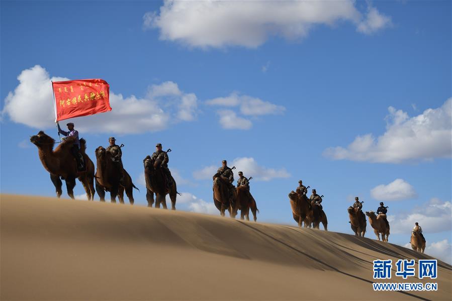 10月15日,阿拉善右旗边防民兵驼兵排民兵、阿拉善边境管理支队民警和当地牧民进行骆驼应用训练。 当日,阿拉善右旗边防民兵驼兵排联合阿拉善边境管理支队民警和当地牧民,在位于内蒙古阿拉善右旗的巴丹吉林沙漠北部进行骆驼应用训练演练,实地检验了当地民兵和民警在沙漠腹地执行巡护任务的能力。 新华社记者 任军川 摄