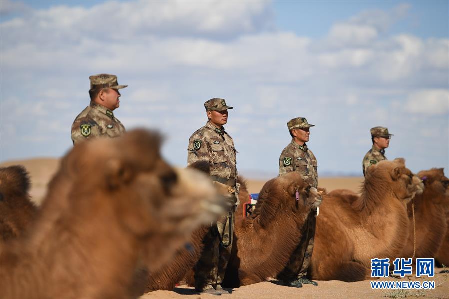 10月15日,阿拉善右旗边防民兵驼兵排民兵进行骆驼应用训练。 当日,阿拉善右旗边防民兵驼兵排联合阿拉善边境管理支队民警和当地牧民,在位于内蒙古阿拉善右旗的巴丹吉林沙漠北部进行骆驼应用训练演练,实地检验了当地民兵和民警在沙漠腹地执行巡护任务的能力。 新华社记者 任军川 摄