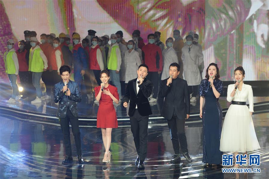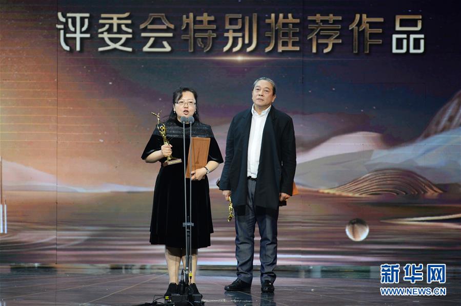 10月18日,评委会特别推荐作品——综艺节目《亚洲文化嘉年华》的代表(右)和电视纪录片《同心战“疫”》的代表(左)在颁奖仪式上。 当晚,第30届中国电视金鹰奖各大奖项在长沙揭晓。 新华社记者 陈振海 摄