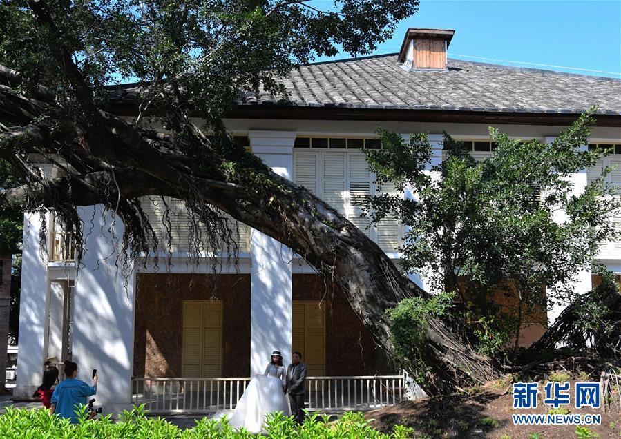 在福州烟台山历史风貌区的建筑前,一对新人在拍摄婚纱照(10月28日摄)。秋日时节,福州各大公园、古街和历史风貌区在明媚阳光下让人流连忘返。新华社记者魏培全摄