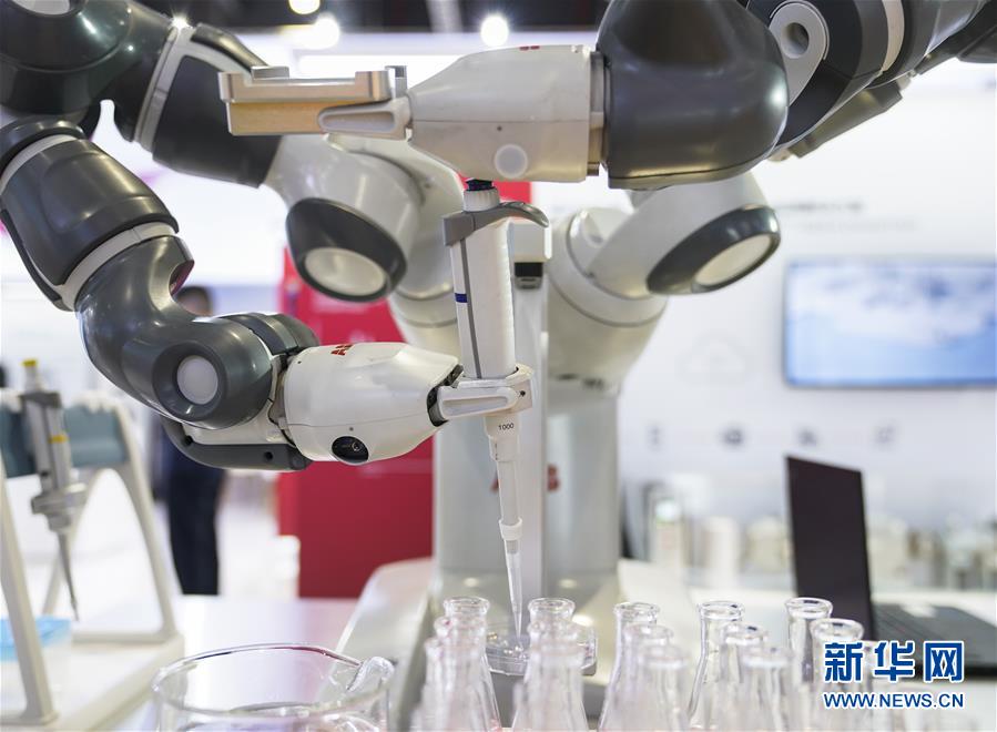 11月9日,在技术装备展区ABB展台,YuMi实验室预处理单元通过机械手进行操作。新华社记者张豪夫摄