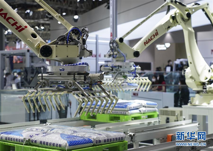 11月9日,在技术装备展区NACHI展台,两只机械臂分别演示码垛、拆垛。在第三届中国国际进口博览会上,智能机器人各显其能,各类机械臂展示在生产、生活中的应用场景,让人们畅想未来智能化社会。新华社记者张豪夫摄