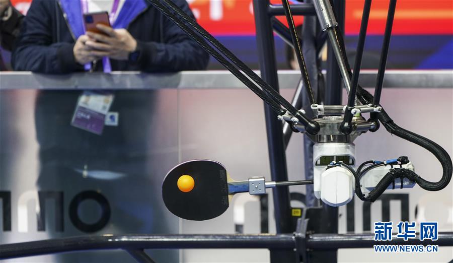 11月8日,在技术装备展区欧姆龙展台,乒乓球教练机器人使用机械臂与观众对战。新华社记者张豪夫摄