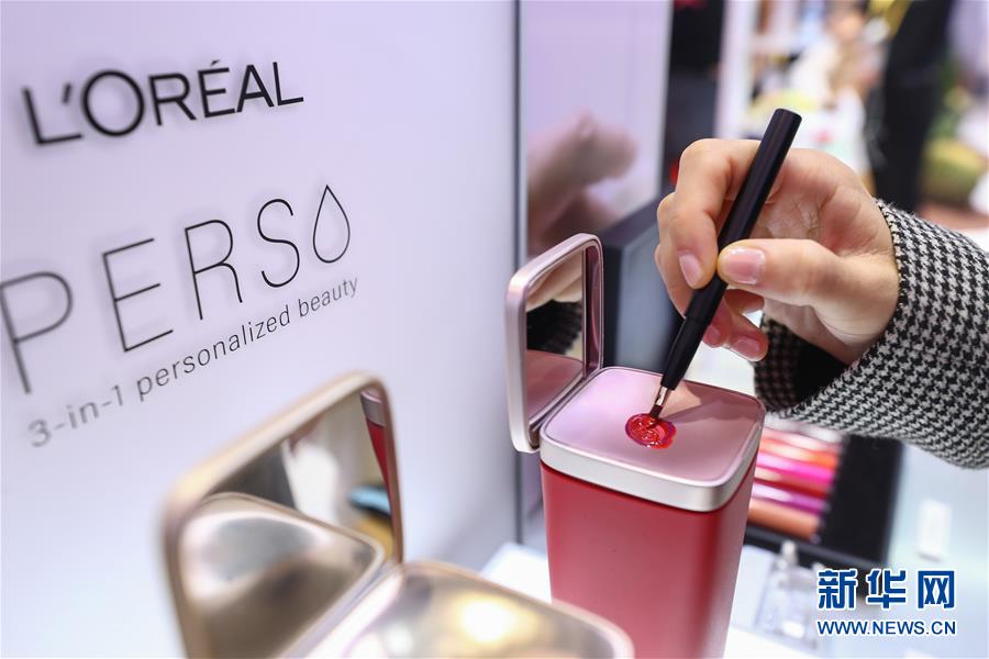 11月9日,参观者在欧莱雅展台上使用Perso定制唇彩。新华社记者张玉薇摄