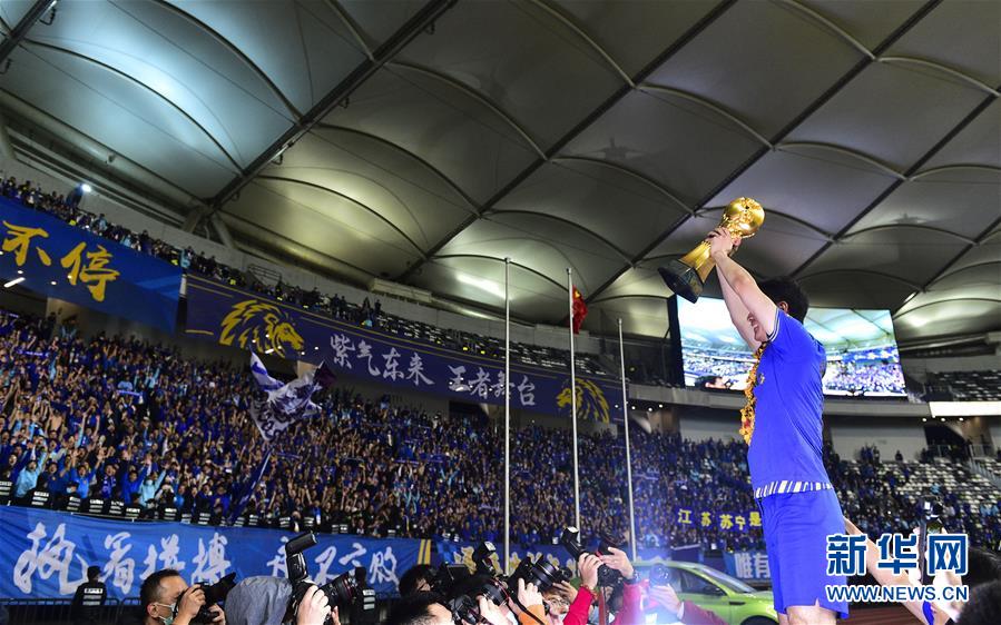 11月12日,江苏苏宁易购队球员吉翔在颁奖仪式后高举冠军奖杯庆祝。当日,在苏州赛区举行的2020赛季中国足球协会超级联赛冠军争夺战次回合比赛中,江苏苏宁易购队以2比1战胜广州恒大淘宝队,从而以两回合总比分2比1取得最后胜利,在球队历史上首夺中超联赛冠军。新华社记者许畅摄
