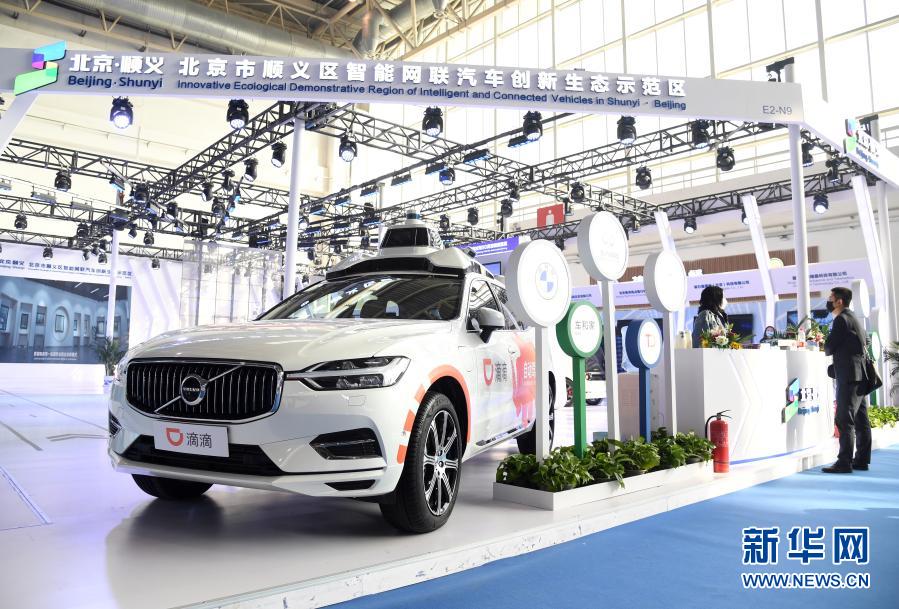 11月12日拍摄的2020世界智能网联汽车大会室内展区中的北京市顺义区智能网联汽车创新生态示范区展位。