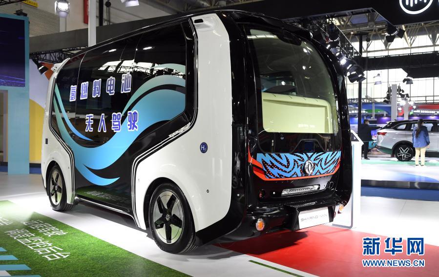 11月12日拍摄的2020世界智能网联汽车大会室内展区展出的氢燃料电池无人驾驶车辆。
