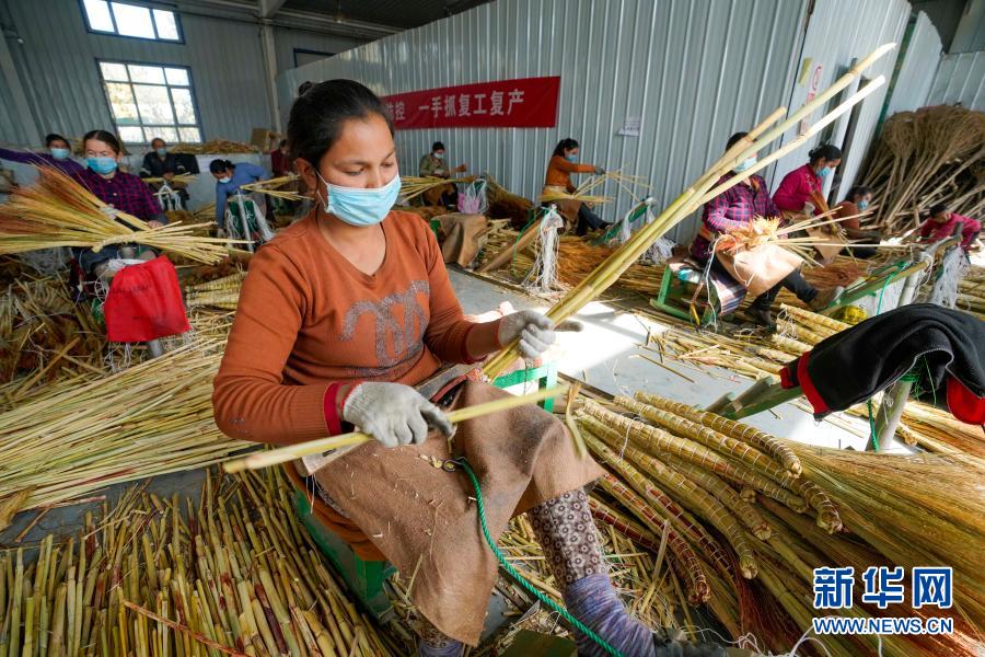 在新疆墨玉县阿克萨拉依乡乌尊艾日克村佳美扫把制作中心,当地村民在制作扫把(10月22日摄)。