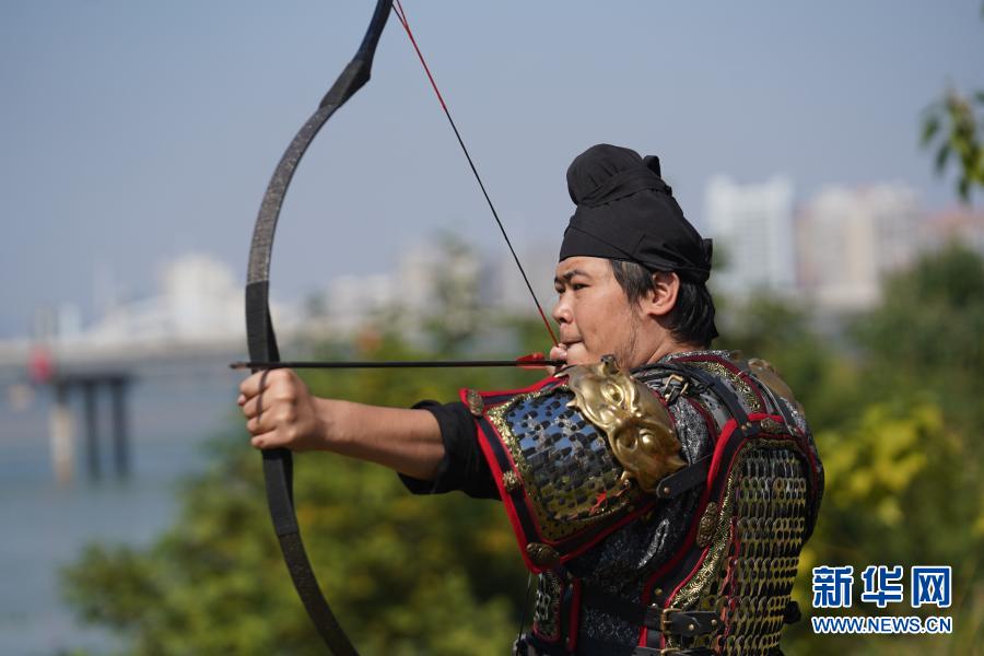 11月13日,在赣州市章贡区,“虔州武备司”成员宋昊演示着甲射箭。新华社记者 周密 摄