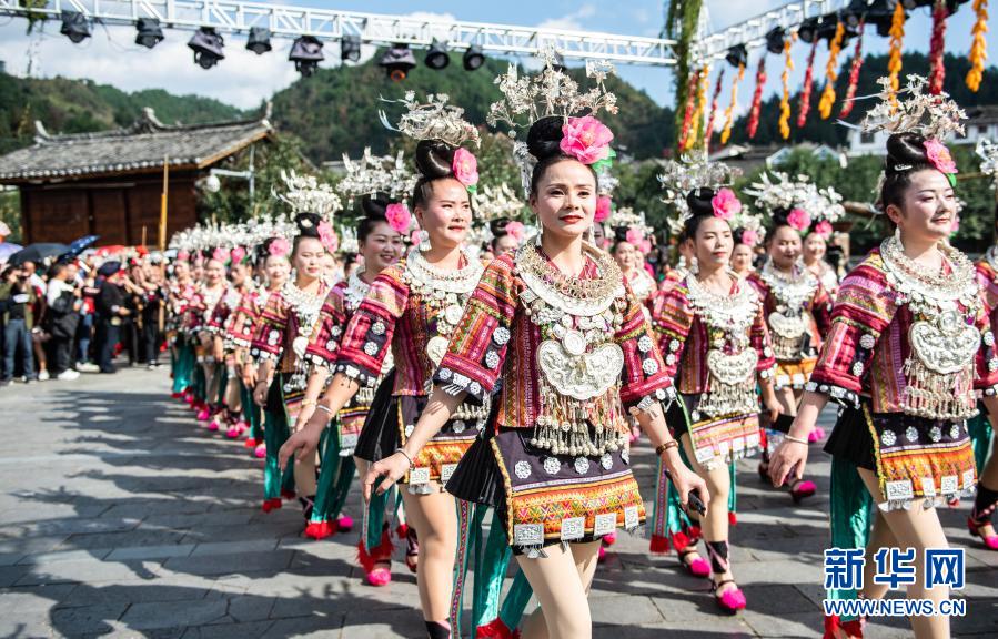当日,贵州省黔东南苗族侗族自治州雷山县举行庆苗年活动。苗族同胞身着节日盛装载歌载舞,欢庆传统节日。“苗年”是苗族同胞集庆祝收获、祭祀祖先、感恩天地为一体的盛大节日。