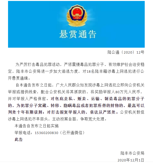 为严厉打击毒品犯罪活动,严惩震慑毒品犯罪分子,有效维护社会治安稳定,12月1日,陆丰市公安局进一步加大追逃力度,发布陆公通〔2020〕12号文,对18名陆丰籍涉毒上网逃犯进行公开悬赏通缉。