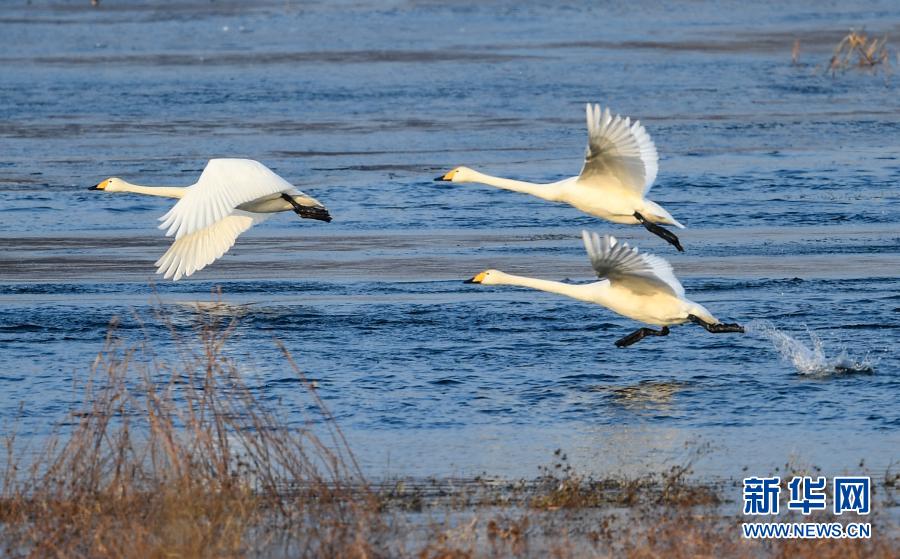这是12月6日在北京怀柔水库拍摄的刚起飞的天鹅。新华社记者陈晔华摄