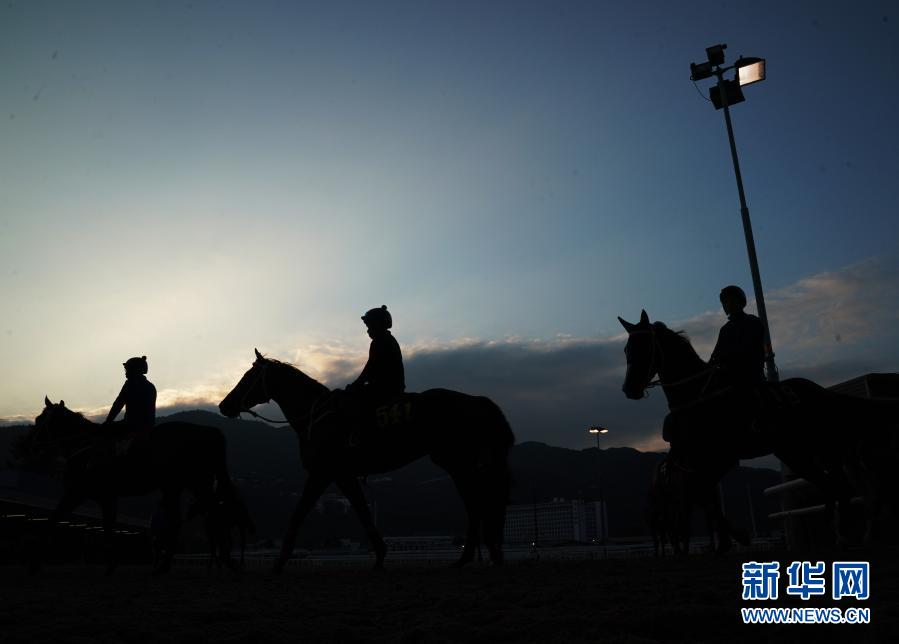 在位于新界的香港赛马会沙田马场,几名骑师和马匹在晨操(12月1日摄)。新华社记者李钢摄