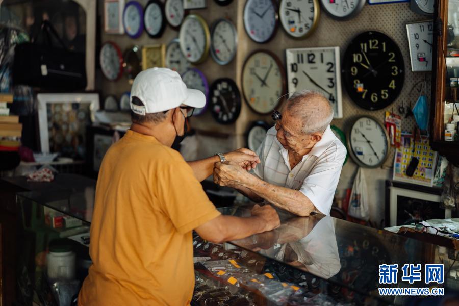 12月5日,在马来西亚雪兰莪州巴生的郁昌表行,韦华为顾客佩戴修好的手表。新华社记者朱炜摄