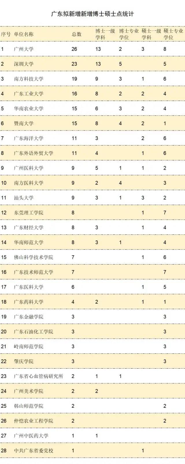 28家单位拟新增233个博士硕士学位授权点。其中,广州大学26个、深圳大学23个、南方科技大学19个成为拟新增博士硕士学位授权点最多的3所单位。