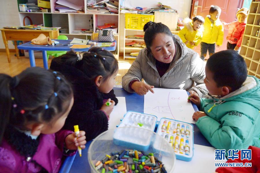在西藏山南市贡嘎县吉雄镇红星社区双语幼儿园,老师次央(左三)指导孩子们绘画(11月25日摄)。新华社记者张汝锋摄