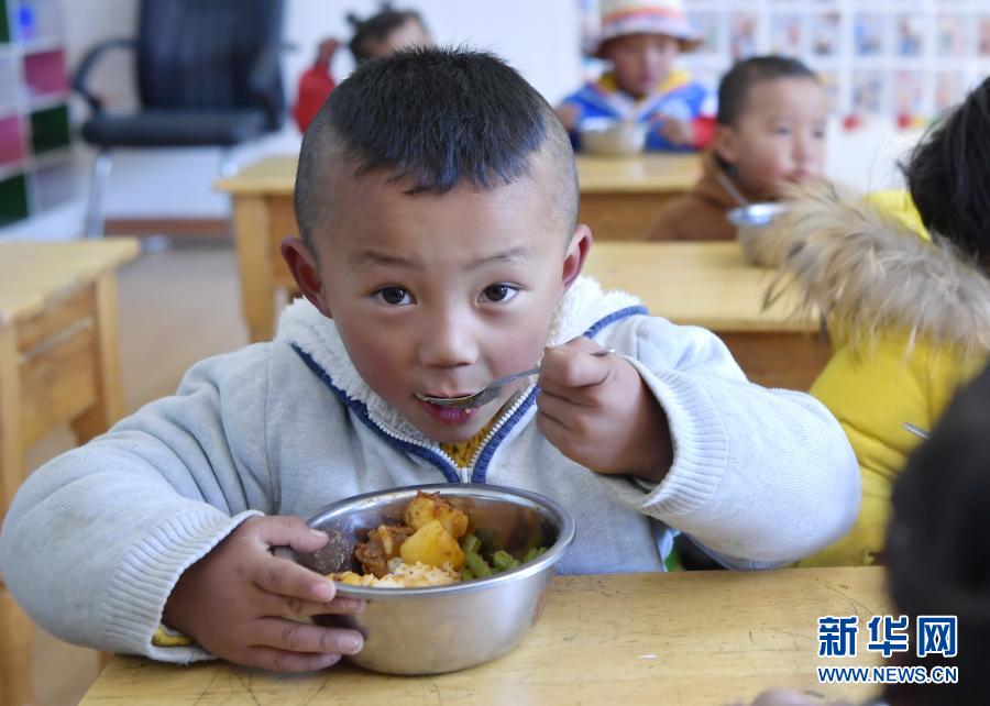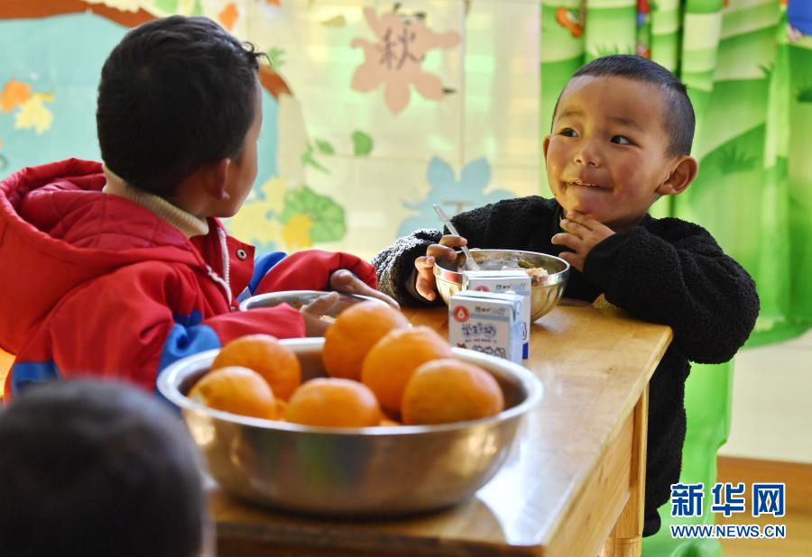 西藏山南市贡嘎县吉雄镇红星社区双语幼儿园的孩子吃午餐(11月25日摄)。新华社记者张汝锋摄