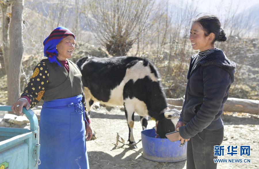 西藏山南市贡嘎县吉雄镇红星社区居民玉珍(右)和邻居卓玛嘎日在院子外聊天(11月25日摄)。新华社记者张汝锋摄