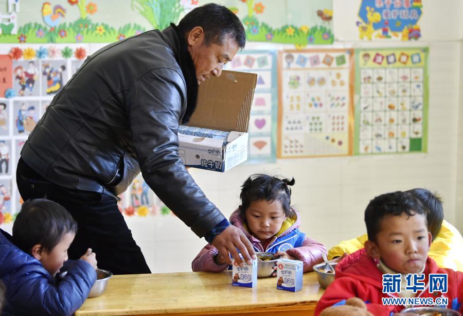 西藏山南市贡嘎县吉雄镇红星社区双语幼儿园的老师为孩子们分发牛奶(11月25日摄)。新华社记者张汝锋摄