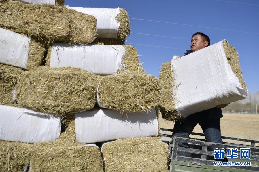 西藏山南市贡嘎县吉雄镇红星社区致富带头人、奶牛养殖基地负责人边巴码放冬储饲草(11月25日摄)。新华社记者张汝锋摄