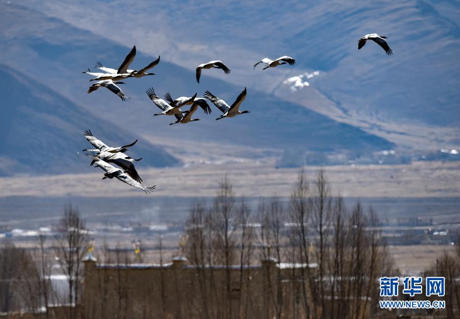 飞翔在林周县黑颈鹤自然保护区上空的黑颈鹤集群(12月12日摄)。新华社记者黄豁摄