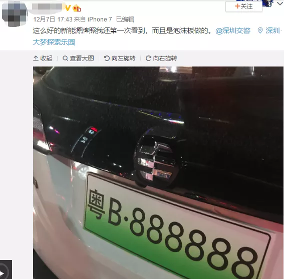 12月7日深圳交警接群众举报称,一辆小型新能源轿车涉嫌使用泡沫板制作的车牌,该车停在龙岗区平吉大道大梦探索乐园内,深圳交警接报后立即对此展开调查。