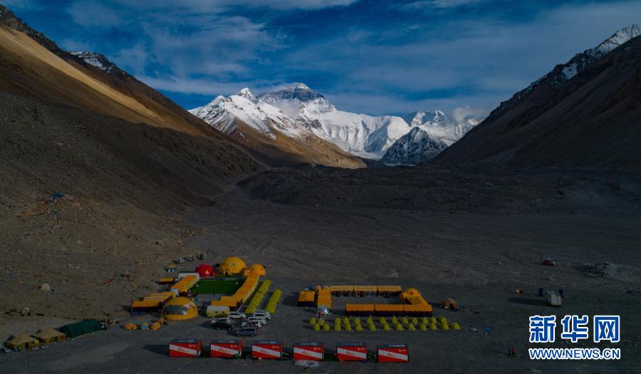 这是5月25日拍摄的珠峰登山大本营及珠峰(无人机照片)。