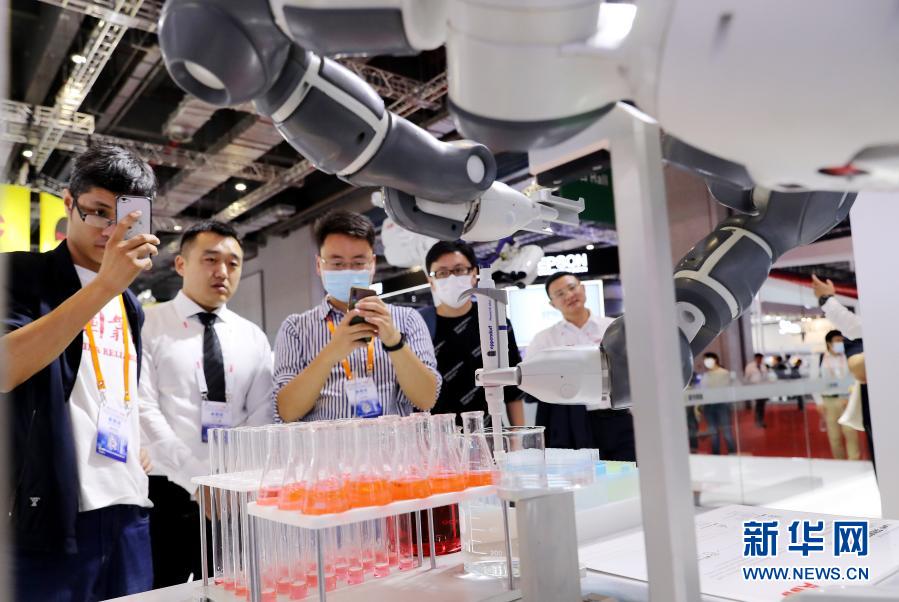 参观者在上海举行的第二十二届中国国际工业博览会上的一个实验室预处理单元前驻足观看(9月15日摄)。新华社记者方喆摄