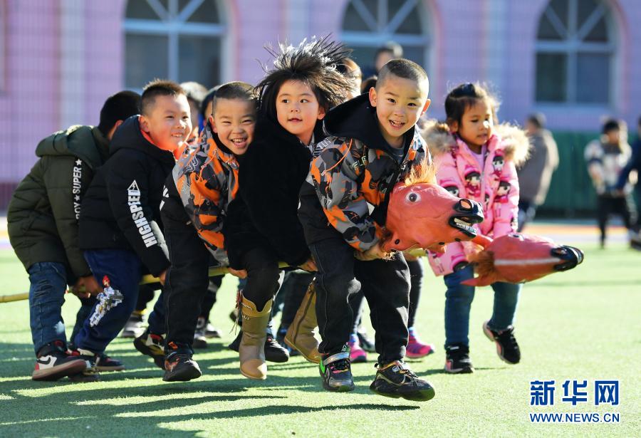 12月14日,河北省乐亭县第三幼儿园的孩子们在玩骑竹马游戏。