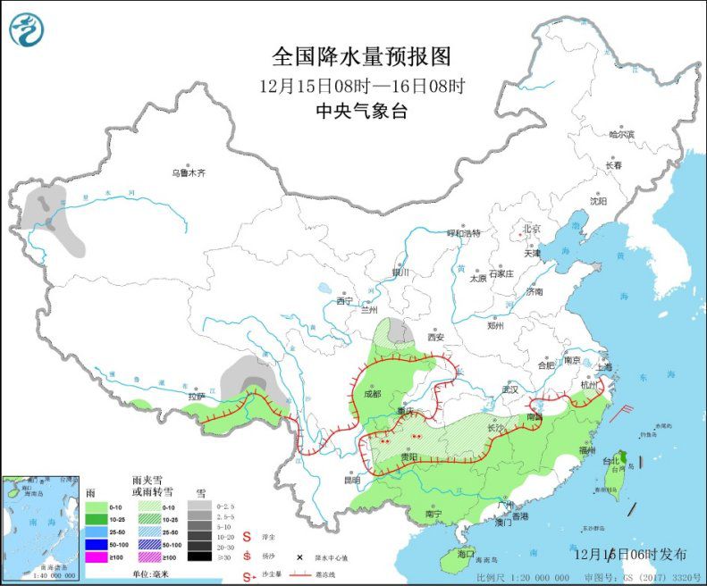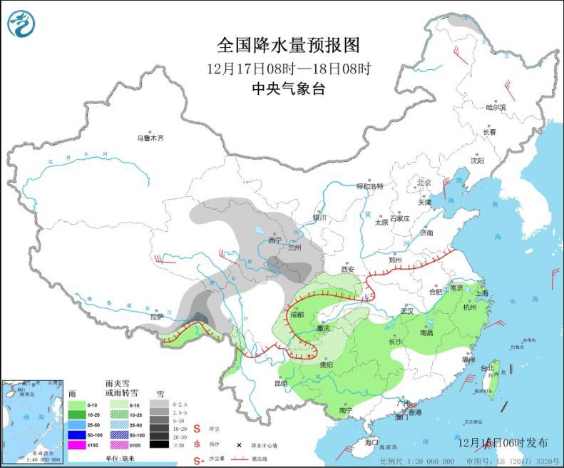 12月17日08时至18日08时,青藏高原东部、西北地区东南部、川西高原北部、贵州中北部及重庆等地部分地区有小雪或雨夹雪,其中,西藏东部、甘肃南部、川西高原北部等地部分地区有中到大雪。四川盆地、江南大部、贵州南部、广西大部、台湾岛大部等地部分地区有小雨。内蒙古东北部、黑龙江西部等地部分地区有4~6级风(见图3)。