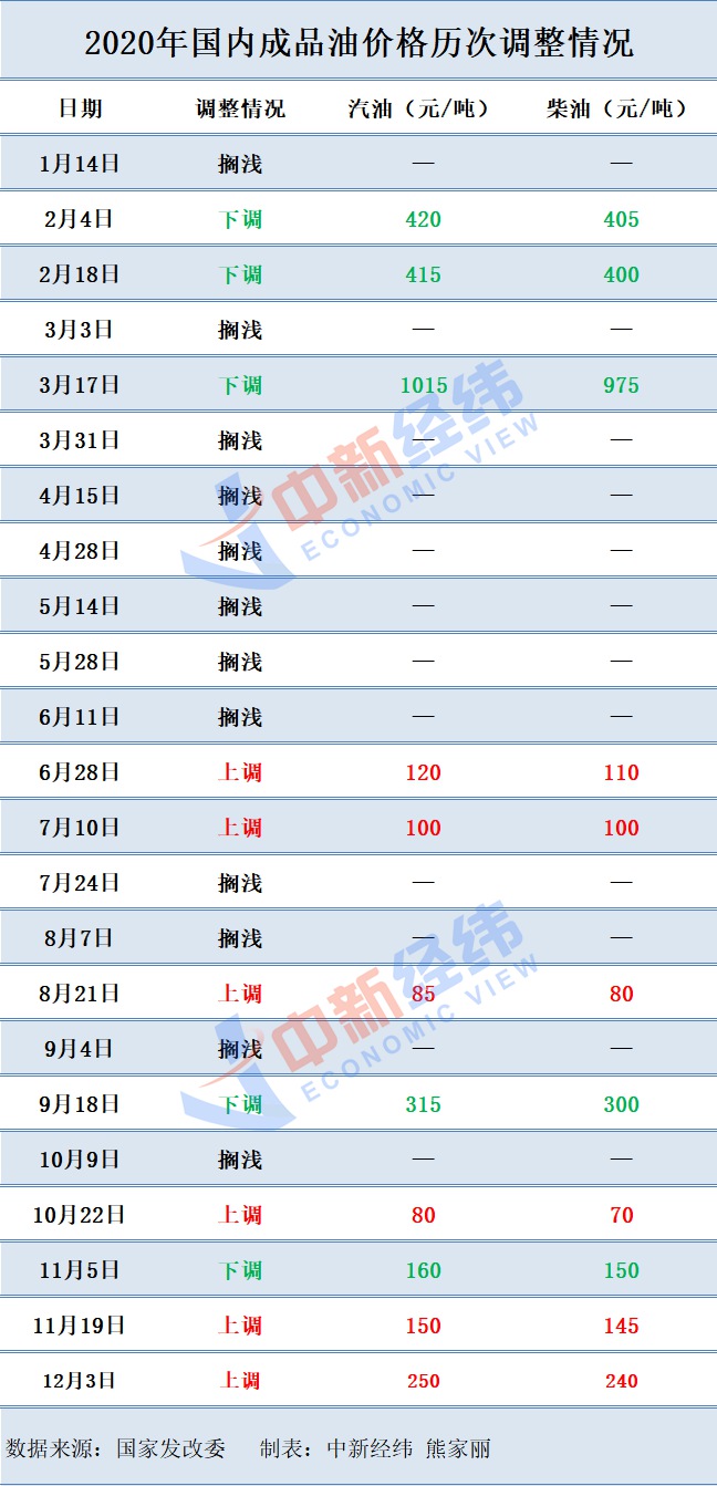 据统计,2020年国内成品油调价已进行23轮,具体为上调6次、下调5次,搁浅12次,汽油累计下调1540元/吨,柴油累计下调1485元/吨。其中,自3月31日至6月11日的6轮调价,由于挂靠原油价格低于40美元/桶的地板价,国内成品油调价连续搁浅。6月28日24时,国内油价年内首次上调。12月3日24时,国内汽、柴油价格每吨分别提高250元和240元,实现年内最大涨幅。若本次调价预期兑现,2020年国内成品油调价将呈现“7涨5跌12搁浅”格局。