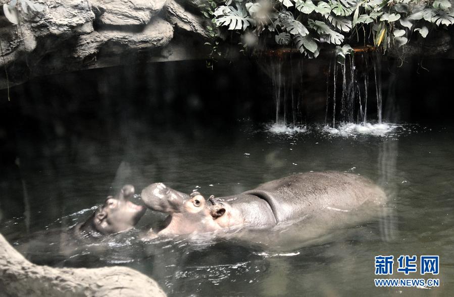12月20日,河马“津津”和它的孩子在恒温水池内嬉戏。