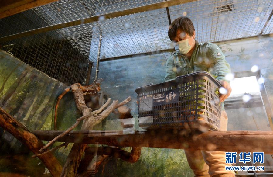 12月20日,北京动物园的饲养员为居住在室内的动物投放食物。