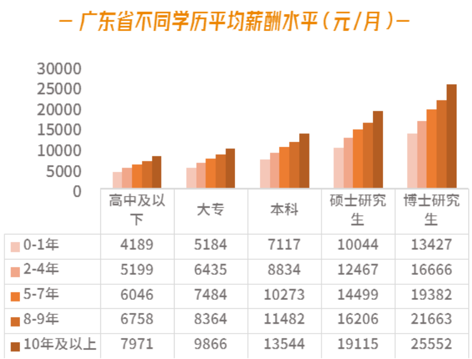 总体来看,广东省职工平均薪酬与学历和工作年限均呈正相关关系,即职工的学历越高、工作年限越长,平均薪酬水平越高。