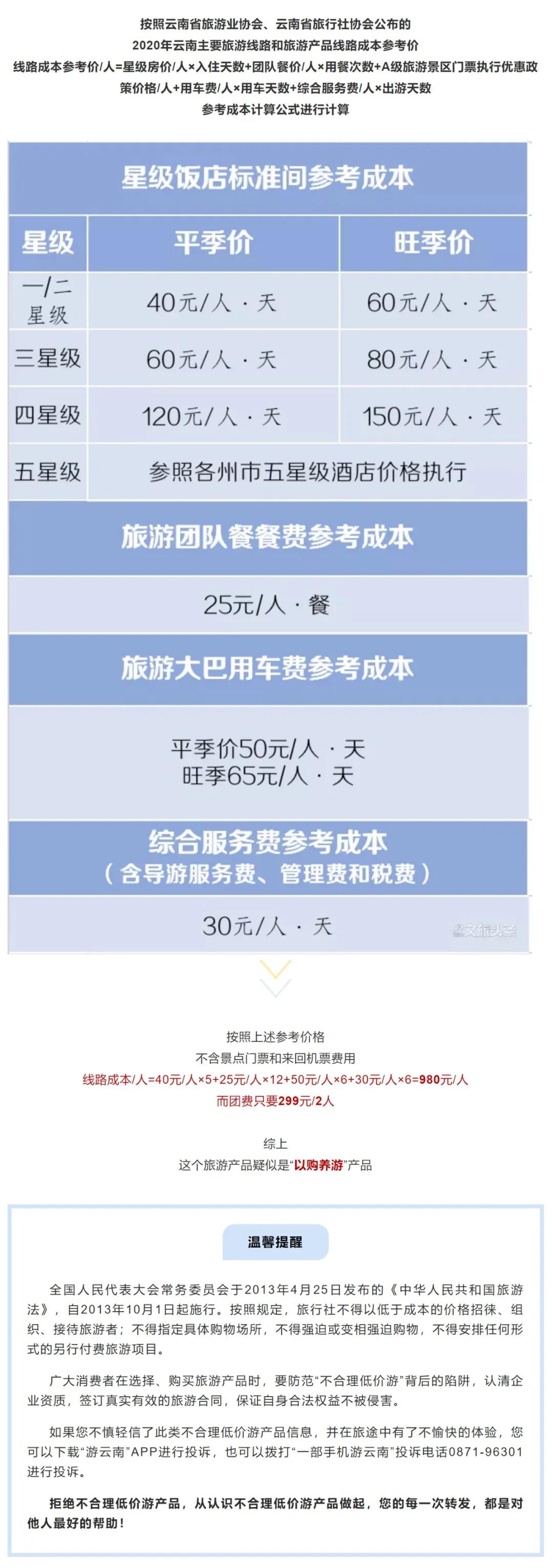 12月15日,云南省旅游执法总队在其官方公众号上发文称,“高火火”售卖的旅游产品疑似为“以购养游”产品。云南省旅游执法总队表示,按照云南省旅游业协会、云南省旅行社协会公布的2020年云南主要旅游线路和旅游产品线路成本参考价计算,不含景点门票和来回机票费用,线路成本费用为每人980元。
